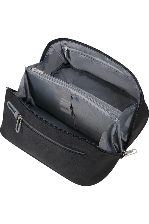 Compartimento Principal - Interior amplo e com vários bolsos com fecho, um bolso elástico aberto, um bolso dedicado para itens molhados e presilhas elásticas, para uma maior organização dos teus cosméticos e produtos de higiene pessoal