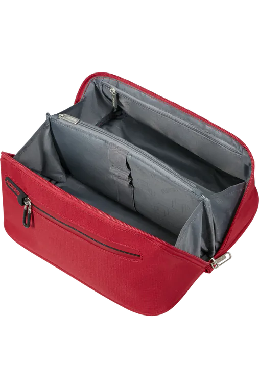 Compartimento Principal - Interior amplo e com vários bolsos com fecho, um bolso elástico aberto, um bolso dedicado para itens molhados e presilhas elásticas, para uma maior organização dos teus cosméticos e produtos de higiene pessoal