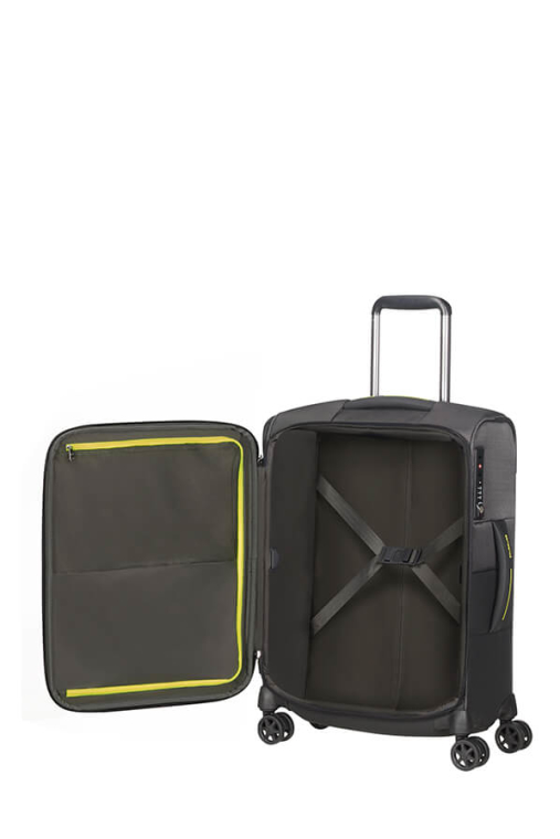 Compartimento Superior - Com divisória, c/ fecho de correr, ideal para o transporte do seu vestuário mais delicado. Detalhes fluorescentes no fecho.