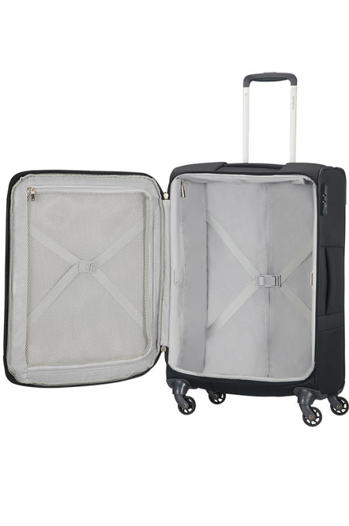 Compartimento Superior - Forrado c/ estampado e c/ cintas funcionais. C/ 1 bolso em rede c/ fecho de correr, para uma melhor organização dos seus bens durante o seu transporte.
