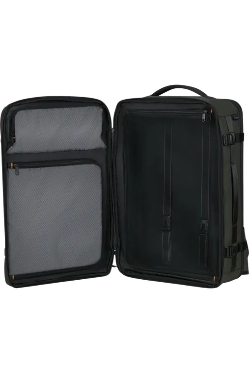 Compartimento | Vestuário - Com organização ampla, cintas ajustáveis e bolso em rede See-Thru™. Com duplo acesso.