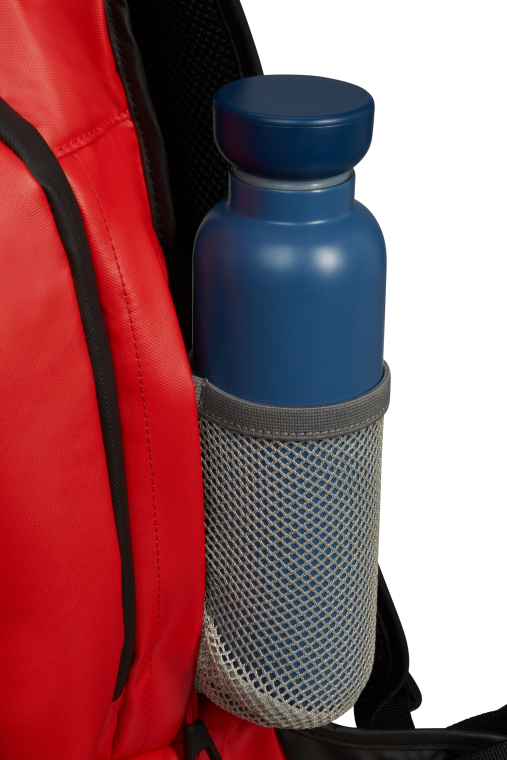 Suporte | Garrafa - Bolso de rede para garrafa integrado no painel lateral.